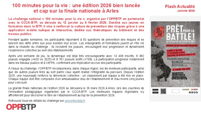 Le challenge national « 100 minutes pour la vie », organisé par l’OPPBTP en partenariat avec le CCCA-BTP, se déroule du 12 janvier au 6 février 2026. Destiné aux jeunes en formation dans le BTP, il vise à renforcer la culture de prévention des risques grâce à une application mobile ludique et interactive, dédiée aux thématiques du bâtiment et des travaux publics.