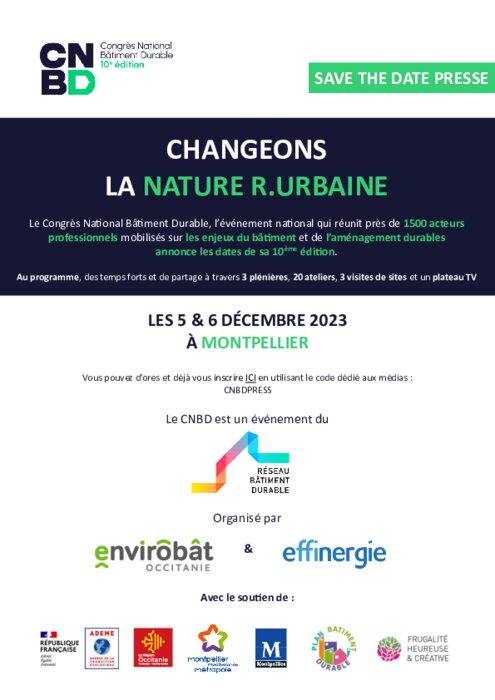 Institutionnels 06 avril 2023 - 08:12 Ce rendez-vous national mobilise chaque année près de 1 500 acteurs professionnels sur les questions de la ville et de l'aménagement durable. Pour son édition 2023 il se tiendra à Montpellier, les 5 et 6 décembre prochains. PDF (245 Ko) Télécharger