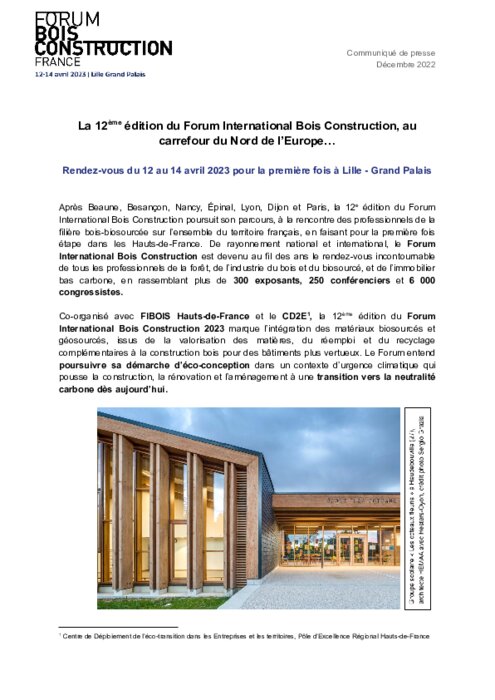 Coorganisé avec Fibois Hauts-de-France et le CD2E, la 12e édition du Forum International Bois Construction 2023 marque l’intégration des matériaux biosourcés et géo-sourcés, issus de la valorisation des matières, du réemploi et du recyclage complémentaires à la construction bois pour des bâtiments plus vertueux.