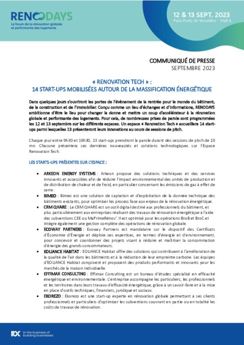 Conçu comme un lieu d’échanges et d’informations, Renodays ambitionne d’être le lieu pour changer la donne et mettre un coup d’accélérateur à la rénovation globale et performante des logements. Pour cela, de nombreuses prises de parole sont programmées les 12 et 13 septembre sur les différents espaces. Un espace « Renovation Tech » accueillera 14 start-ups parmi lesquelles 13 présenteront leurs innovations au cours de sessions de pitch.