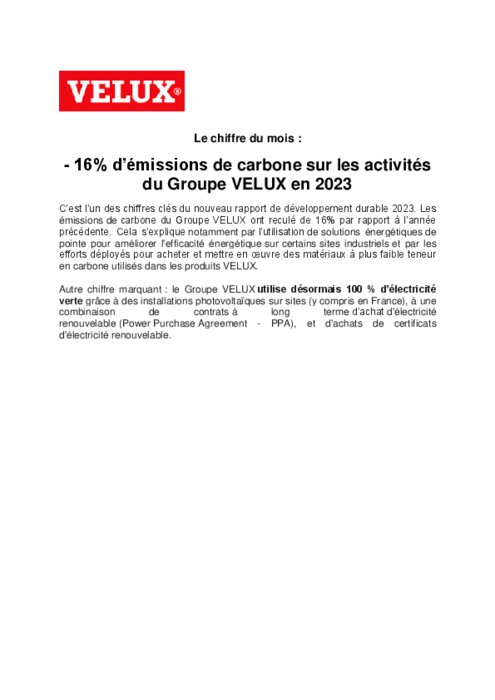 - 16% d’émissions de carbone sur les activités du Groupe VELUX en 2023