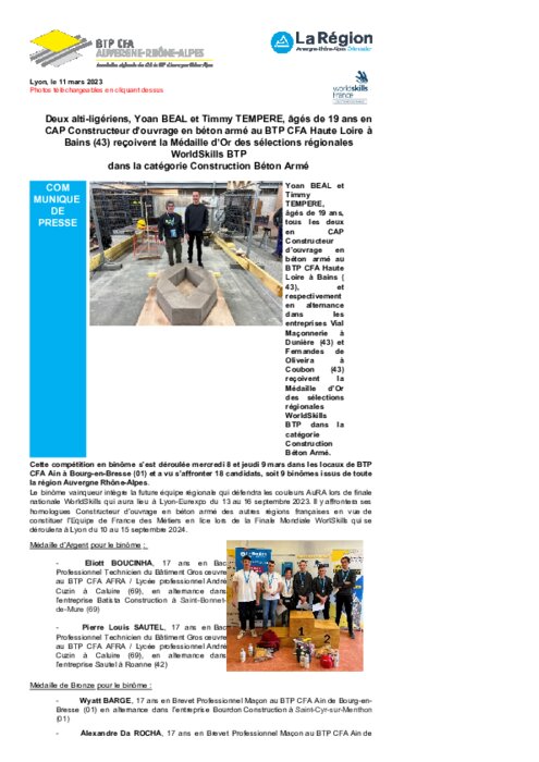 Yoan Beal et Timmy Tempere, âgés de 19 ans, tous les deux en CAP Constructeur d’ouvrage en béton armé au BTP CFA Haute-Loire à Bains (43), et respectivement en alternance dans les entreprises Vial Maçonnerie à Dunière (43) et Fernandes de Oliveira à Coubon (43) reçoivent la Médaille d’Or des sélections régionales WorldSkills BTP.