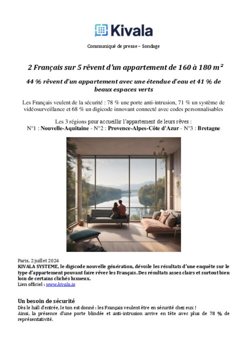 Industriels 02 juillet 2024 - 09:49 KIVALA SYSTEME, le digicode nouvelle génération, dévoile les résultats d’une enquête sur le type d’appartement pouvant faire rêver les Français. Des résultats assez clairs et surtout bien loin de certains clichés luxueux. PDF (412 Ko) Télécharger