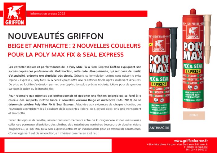 2 nouvelles couleurs pour la poly max & seal express de Griffon