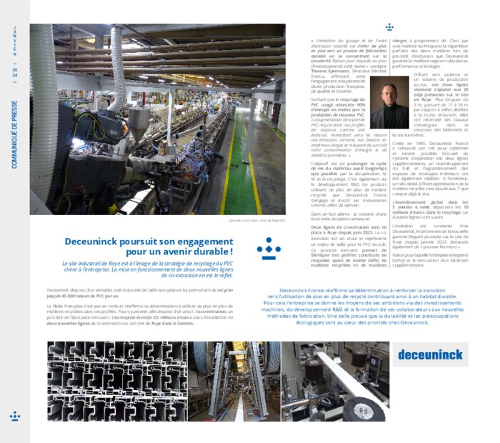 matières recyclées dans ses profilés. Pour y parvenir, elle dispose d’un atout : la co-extrusion, un procédé de fabrication innovant. L’entreprise investit 2,5 millions d’euros dans l’installation de deux nouvelles lignes de co-extrusion sur son site de Roye dans la Somme.