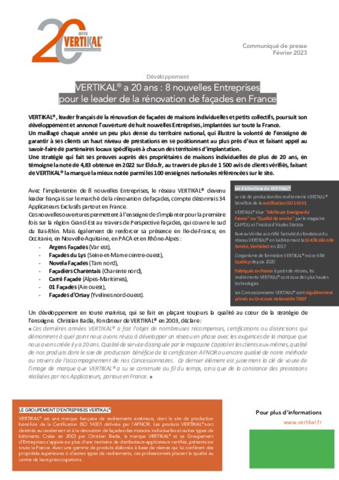 Vertikal, leader français de la rénovation de façades de maisons individuelles et petits collectifs, fête ses 20 ans et poursuit son développement et annonce l'ouverture de huit nouvelles Entreprises, implantées sur toute la France. Un maillage chaque année un peu plus dense du territoire national, qui illustre la volonté de l'enseigne de garantir à ses clients un haut niveau de prestations en se positionnant au plus près d'eux