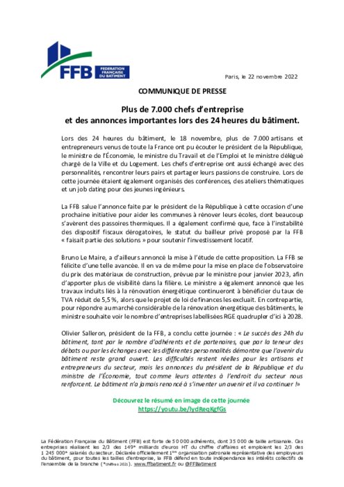 Lors des 24 heures du bâtiment, le 18 novembre, plus de 7 000 artisans et entrepreneurs venus de toute la France ont pu écouter le président de la République, le ministre de l’Économie, le ministre du Travail et de l’Emploi et le ministre délégué chargé de la Ville et du Logement. Les chefs d’entreprise ont aussi échangé avec des personnalités, rencontrer leurs pairs et partager leurs passions de construire.