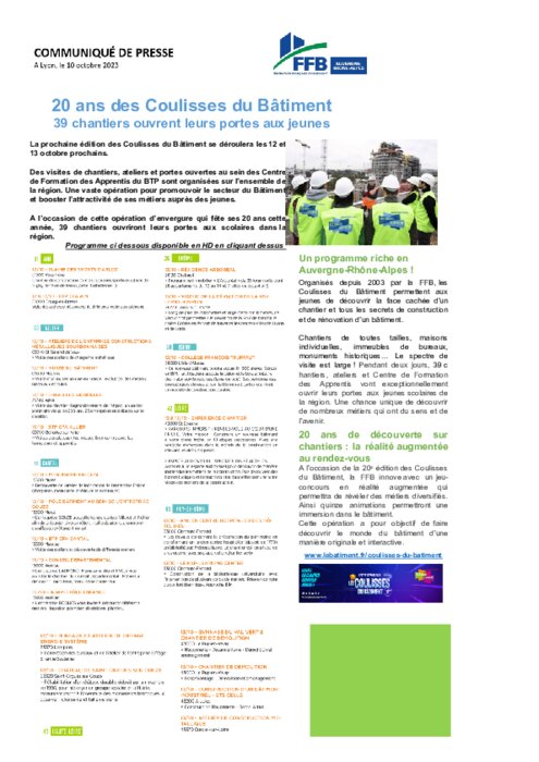 La prochaine édition des Coulisses du Bâtiment se déroulera les 12 et 13 octobre prochains. A l’occasion de cette opération d’envergure qui fête ses 20 ans cette année, 39 chantiers ouvriront leurs portes aux scolaires dans la région.