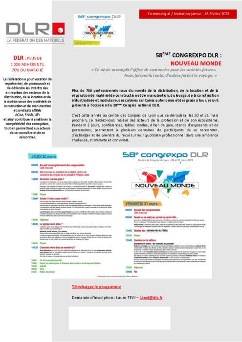 Plus de 700 professionnels issus du monde de la distribution, de la location et de la réparation de matériel de construction et de manutention, du levage, de la construction industrialisée et modulaire, des cabines sanitaires autonomes et des grues à tour, seront présents à l’occasion du 58ème Congrès national DLR.