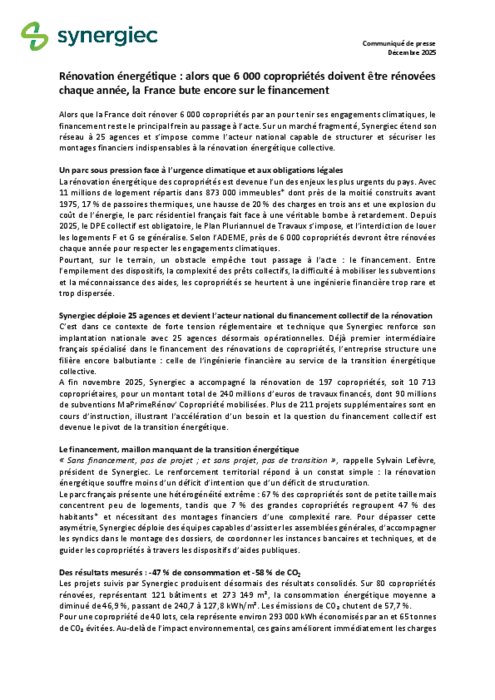 Alors que la France doit rénover 6 000 copropriétés/an pour tenir ses engagements climatiques, le financement reste le principal frein au passage à l’acte. Sur un marché fragmenté, Synergiec étend son réseau à 25 agences et s’impose comme l’acteur national capable de structurer et sécuriser les montages financiers indispensables à la rénovation énergétique collective.