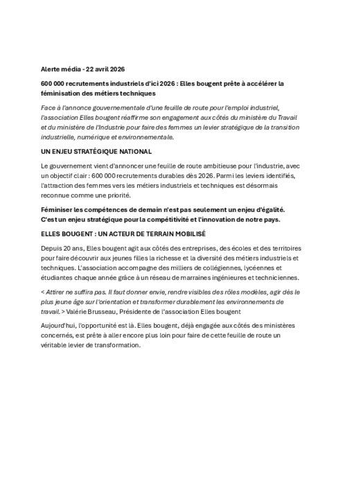 Face à l'annonce gouvernementale d'une feuille de route pour l'emploi industriel, l'association Elles bougent réaffirme son engagement aux côtés du ministère du Travail et du ministère de l'Industrie pour faire des femmes un levier stratégique de la transition industrielle, numérique et environnementale.