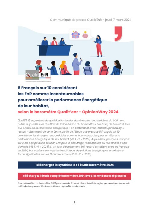 Qualit’EnR, l’organisme de qualification leader des énergies renouvelables du bâtiment, publie aujourd'hui les résultats de la 13e édition du baromètre « Les Français & les EnR face aux enjeux de la rénovation énergétique », en partenariat avec l’institut OpinionWay. Il ressort notamment de cette 2ème partie de l’étude que presque 8 Français sur 10 considèrent les énergies renouvelables comme incontournables pour améliorer la performance énergétique de leur habitat (79 % +2 v. 2023).