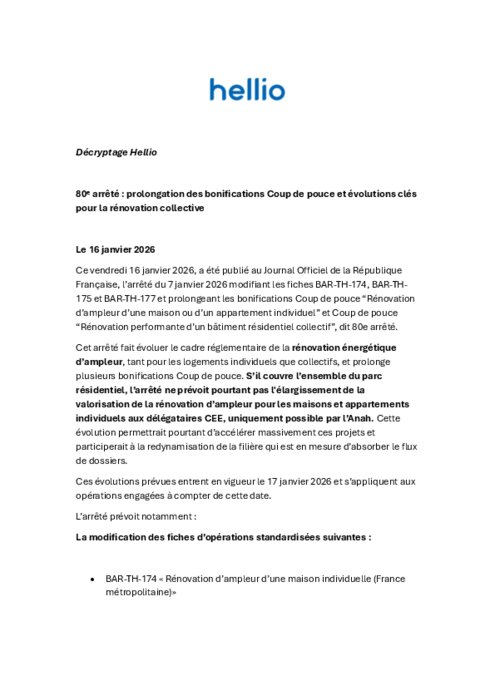 80ᵉ arrêté : prolongation des bonifications Coup de pouce (Hellio)