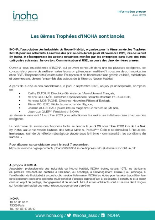 INOHA, l’association des Industriels du Nouvel Habitat, organise, pour la 8ème année, les Trophées INOHA pour ses adhérents. La remise des prix se déroulera le jeudi 23 novembre 2023, lors de La nuit By Inoha, et récompensera les actions novatrices menées par les entreprises dans l’une des trois catégories suivantes : Innovation, Communication et RSE, au cours des deux dernières années.