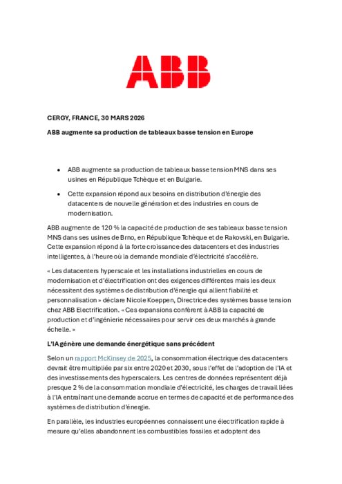 ABB augmente de 120 % la capacité de production de ses tableaux basse tension MNS dans ses usines de Brno, en République Tchèque et de Rakovski, en Bulgarie. Cette expansion répond à la forte croissance des datacenters et des industries intelligentes, à l’heure où la demande mondiale d’électricité s’accélère.