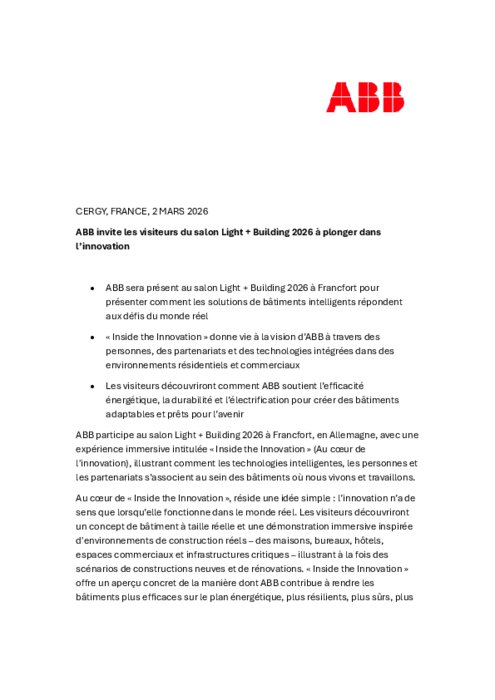 ABB participe au salon Light + Building 2026 à Francfort, en Allemagne, avec une expérience immersive intitulée « Inside the Innovation » (Au cœur de l'innovation), illustrant comment les technologies intelligentes, les personnes et les partenariats s’associent au sein des bâtiments où nous vivons et travaillons.