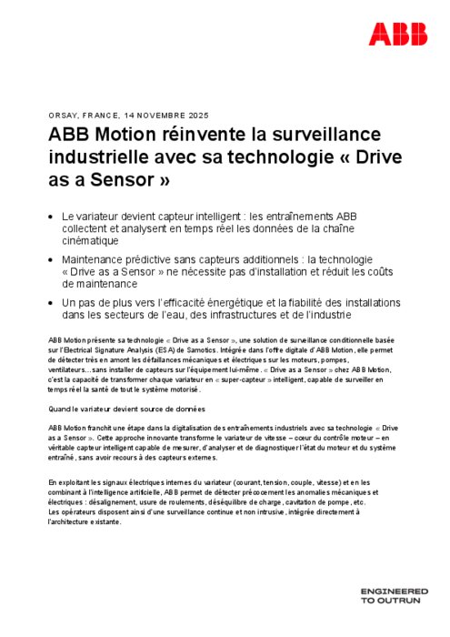 ABB Motion présente sa technologie « Drive as a Sensor », une solution de surveillance conditionnelle basée sur l’Electrical Signature Analysis (ESA) de Samotics. Intégrée dans l’offre digitale d’ABB Motion, elle permet de détecter très en amont les défaillances mécaniques et électriques sur les moteurs, pompes, ventilateurs…sans installer de capteurs sur l’équipement lui-même. « Drive as a Sensor » chez ABB Motion, c’est la capacité de transformer chaque variateur en « super-capteur » intelligent, capable de surveiller en temps réel la santé de tout le système motorisé.