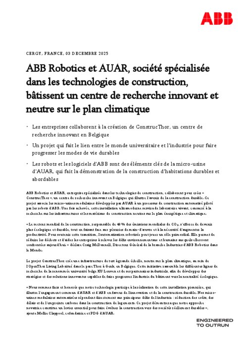 ABB Robotics et AUAR, entreprise spécialisée dans les technologies de construction, collaborent pour créer « ConstrucThor », un centre de recherche innovant en Belgique qui illustre l’avenir de la construction durable. Ce projet associe les micro-usines modulaires développées par AUAR à un processus de construction automatisé piloté par les robots d’ABB. Une fois achevée, cette installation ultramoderne servira de laboratoire vivant, consacré à la recherche sur les infrastructures et les matériaux de construction neutres sur le plan énergétique et climatique.