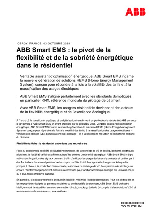 À l’heure où la transition énergétique et la digitalisation transforment en profondeur le résidentiel, ABB annonce le lancement d’ABB Smart EMS en avant-première sur le salon IBS 2025. Véritable assistant d’optimisation énergétique, ABB Smart EMS incarne la nouvelle génération de solutions HEMS (Home Energy Management System), conçue pour répondre à la fois à la volatilité des tarifs, à la massification des usages électriques – véhicules électriques (VE), pompes à chaleur, stockage – et à la nécessaire réduction de l’empreinte carbone du bâtiment.