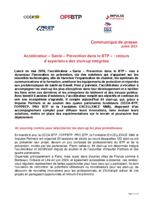 Avec bientôt 6 années d’existence, l’accélérateur remplit ses objectifs et continue de voir son écosystème s’agrandir. Il compte aujourd’hui 84 start-up, qui, grâce à Impulse Partners et au soutien des quatre partenaires fondateurs (CCCA-BTP, l’OPPBTP, PRO BTP et la Fondation EXCELLENCE SMA), disposent d’un accompagnement complet pour diffuser leurs innovations, faire évoluer leurs solutions, mettre en place des expérimentations sur le terrain et poursuivre leur