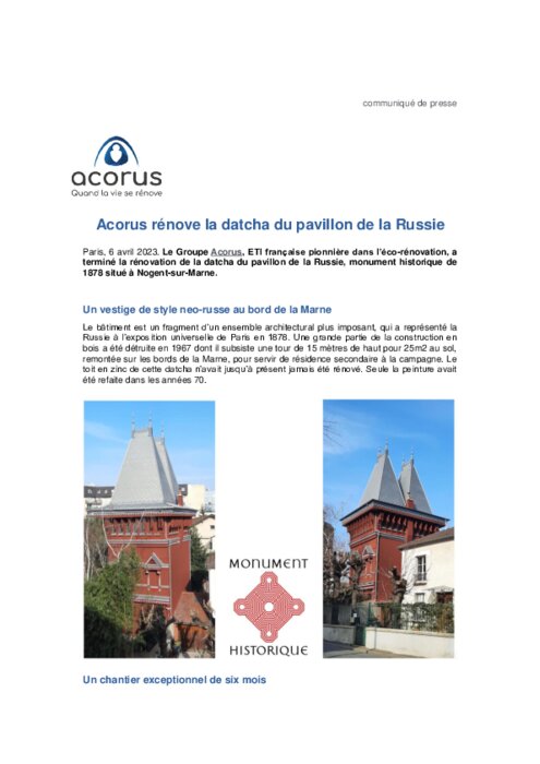 Le Groupe Acorus, ETI française pionnière dans l’éco-rénovation, a terminé la rénovation de la datcha du pavillon de la Russie, monument historique de 1878 situé à Nogent-sur-Marne.