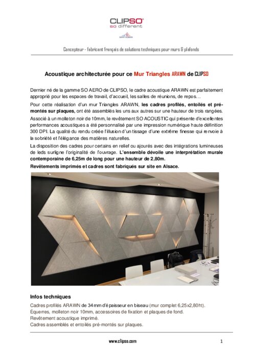 Dernier né de la gamme SO AERO de CLIPSO, le cadre acoustique ARAWN est parfaitement approprié pour les espaces de travail, d’accueil, les salles de réunions, de repos… Pour cette réalisation d’un mur Triangles ARAWN, les cadres profilés, entoilés et pré-montés sur plaques, ont été assemblés les uns aux autres sur une hauteur de trois rangées.