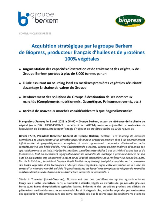 Industriels 03 avril 2023 - 08:30 Groupe Berkem, acteur de référence de la chimie du végétal, annonce aujourd’hui la réalisation de l’acquisition de Biopress, producteur français d’huiles et de protéines végétales 100% naturelles. PDF (314 Ko) Télécharger