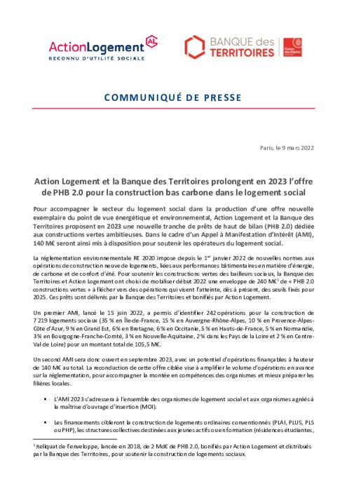 Action Logement et la Banque des Territoires proposent en 2023 une nouvelle tranche de prêts de haut de bilan (PHB 2.0) dédiée aux constructions vertes ambitieuses. Dans le cadre d’un Appel à Manifestation d’Intérêt (AMI), 140 M€ seront ainsi mis à disposition pour soutenir les opérateurs du logement social.