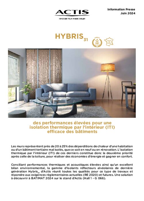 Conciliant performances thermiques et acoustiques élevées ainsi qu’un excellent bilan environnemental, la gamme d’isolants réflecteurs alvéolaires de dernière génération Hybris31 d’Actis réunit toutes les qualités pour ce type de travaux et répondre aux exigences règlementaires actuelles (RE 2020) et futures. Une solution à découvrir à BATIMAT 2024 sur le stand d’Actis (Hall 1 - G 066).