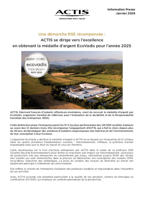 Industriels 12 janvier 2026 - 11:59 ACTIS, fabricant français d’isolants réflecteurs alvéolaires, vient de recevoir la médaille d’argent par EcoVadis, organisme mondial de référence pour l’évaluation de la durabilité et de la Responsabilité Sociétale des Entreprises (RSE). PDF (592 Ko) Télécharger