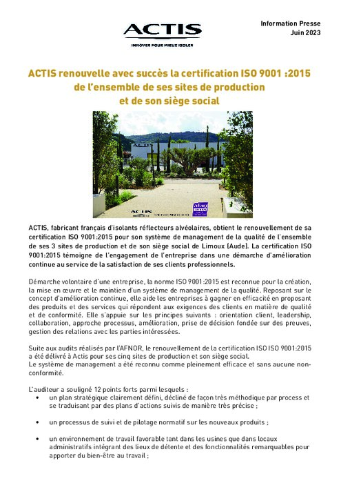 ACTIS, fabricant français d’isolants réflecteurs alvéolaires, obtient le renouvellement de sa certification ISO 9001:2015 pour son système de management de la qualité de l’ensemble de ses 3 sites de production et de son siège social de Limoux (Aude). La certification ISO 9001:2015 témoigne de l’engagement de l’entreprise dans une démarche d’amélioration continue au service de la satisfaction de ses clients professionnels.