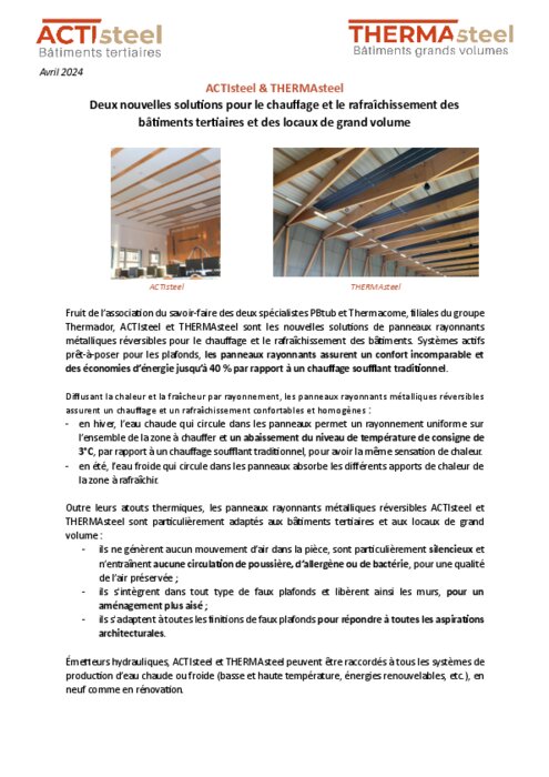 Fruit de l’association du savoir-faire des deux spécialistes PBtub et Thermacome, filiales du groupe Thermador, ACTIsteel et THERMAsteel sont les nouvelles solutions de panneaux rayonnants métalliques réversibles pour le chauffage et le rafraîchissement des bâtiments. Systèmes actifs prêt-à-poser pour les plafonds, les panneaux rayonnants assurent un confort incomparable et des économies d’énergie jusqu’à 40 % par rapport à un chauffage soufflant traditionnel.