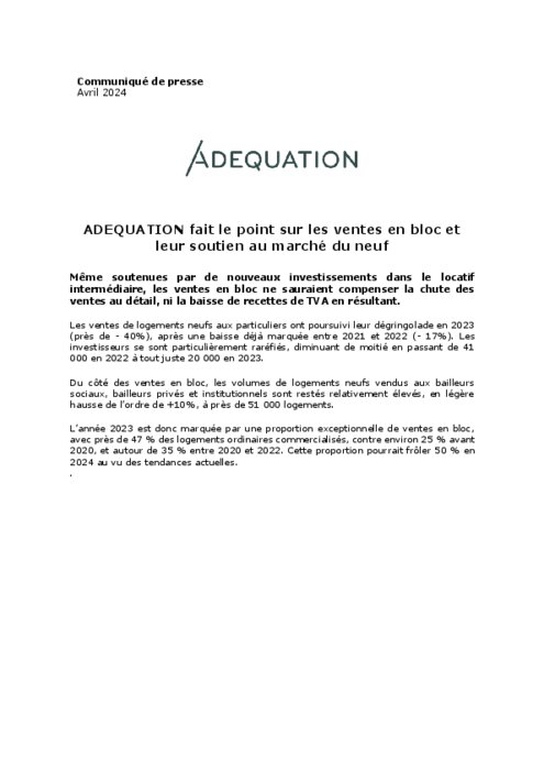 Même soutenues par de nouveaux investissements dans le locatif intermédiaire, les ventes en bloc ne sauraient compenser la chute des ventes au détail, ni la baisse de recettes de TVA en résultant. Les ventes de logements neufs aux particuliers ont poursuivi leur dégringolade en 2023 (près de - 40%), après une baisse déjà marquée entre 2021 et 2022 (- 17%). Les investisseurs se sont particulièrement raréfiés, diminuant de moitié en passant de 41 000 en 2022 à tout juste 20 000 en 2023.
