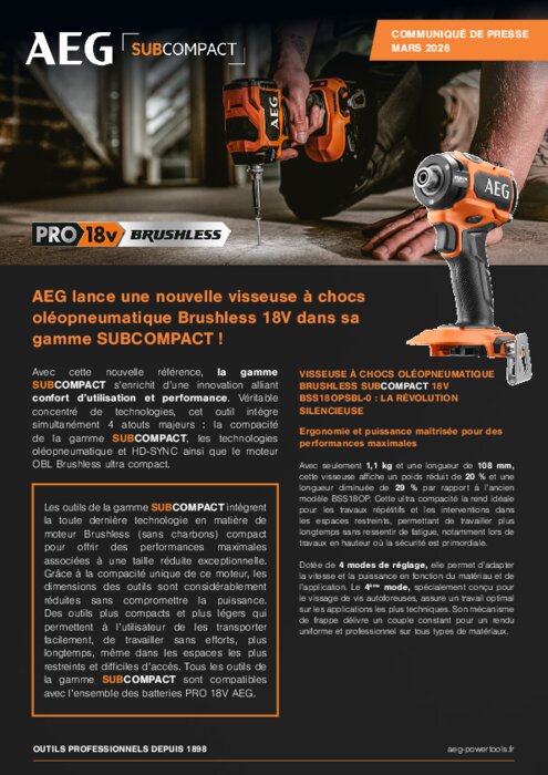 AEG, marque référence dans l'outillage professionnel, enrichit sa gamme SUBCOMPACT avec une nouvelle visseuse à chocs oléopneumatique Brushless 18V.