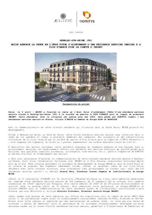 ÆGIDE a finalisé la vente en l’état futur d'achèvement (Véfa) d’une résidence services seniors située à Herblay-sur-Seine (95) à la société de gestion A PLUS FINANCE pour le compte du promoteur IMODEV. Cette résidence, dont la livraison est prévue pour mai 2025, sera gérée par DOMITYS, numéro 1 des résidences services seniors en France, filiale d’ÆGIDE et membre du Groupe AG2R LA MONDIALE.