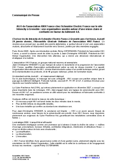 C’est sur le site Intencity de Schneider Electric France à Grenoble que s’est tenue, le jeudi 29 janvier dernier, l’Assemblée Générale Ordinaire de l’association KNX France. Un rendez-vous annuel qui, au-delà des points statutaires, a surtout donné à voir une association mature, structurée et résolument tournée vers l’avenir, portée par des membres engagés.