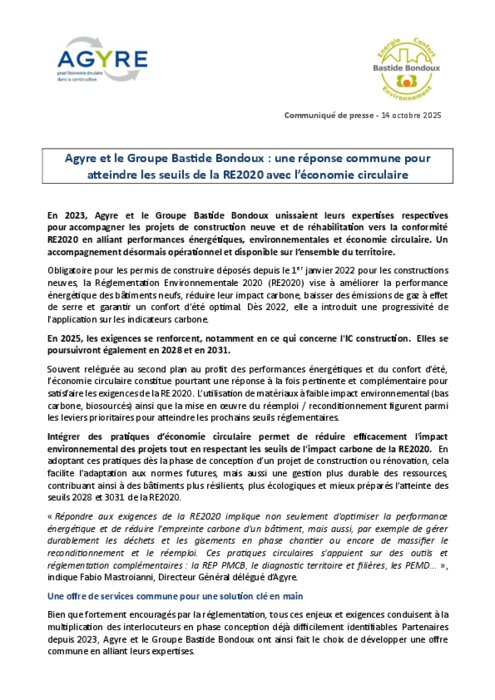 En 2023, Agyre et le Groupe Bastide Bondoux unissaient leurs expertises respectives pour accompagner les projets de construction neuve et de réhabilitation vers la conformité RE2020 en alliant performances énergétiques, environnementales et économie circulaire. Un accompagnement désormais opérationnel et disponible sur l’ensemble du territoire.