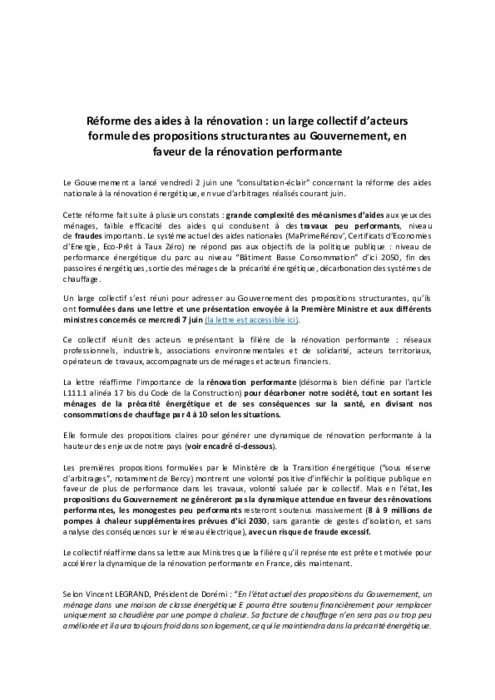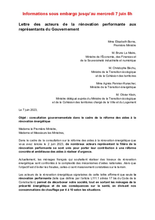 Un large collectif s’est réuni pour adresser au Gouvernement des propositions structurantes, qu’ils ont formulées dans une lettre et une présentation envoyée à la Première Ministre et aux différents ministres concernés ce mercredi 7 juin. Ce collectif réunit des acteurs représentant la filière de la rénovation performante : réseaux professionnels, industriels, associations environnementales et de solidarité, acteurs territoriaux, opérateurs de travaux, accompagnateurs de ménages et financiers.
