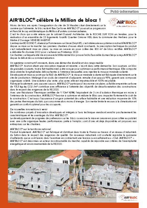 Industriels 26 février 2024 - 10:48 Moins de trois ans après l’inauguration du site de St Maudez situé directement sur la carrière qui l’alimente, le bloc isolant Bas Carbone AIR’BLOC poursuit sa progression et franchit le cap emblématique du Million d’unités commercialisées. PDF (172 Ko) Télécharger
