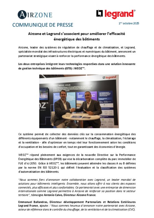 Airzone, leader des systèmes de régulation de chauffage et de climatisation, et Legrand, spécialiste mondial des infrastructures électriques et numériques du bâtiment, annoncent un partenariat stratégique visant à renforcer la performance énergétique des bâtiments. Les deux entreprises intègrent leurs technologies respectives dans une solution innovante de gestion technique des bâtiments (GTB) : WEOZ™.