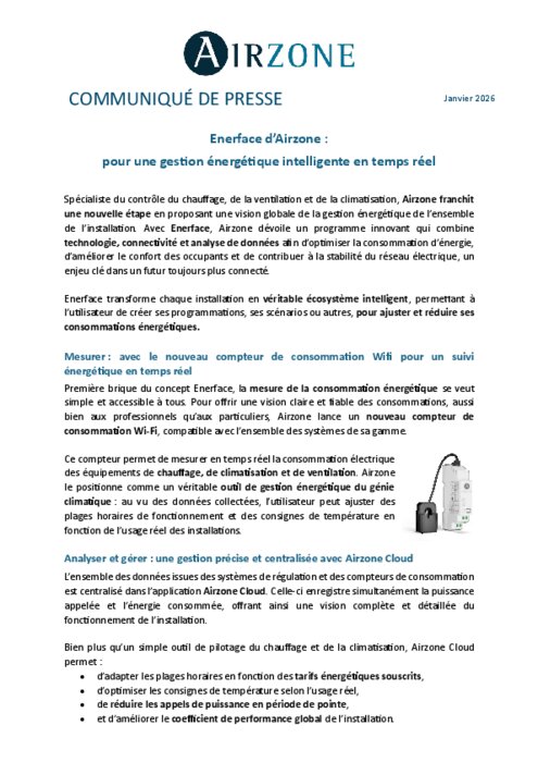 Spécialiste du contrôle du chauffage, de la ventilation et de la climatisation, Airzone franchit une nouvelle étape en proposant une vision globale de la gestion énergétique de l’ensemble de l’installation. Avec Enerface, Airzone dévoile un programme innovant qui combine technologie, connectivité et analyse de données afin d’optimiser la consommation d’énergie, d’améliorer le confort des occupants et de contribuer à la stabilité du réseau électrique, un enjeu clé dans un futur toujours plus connecté.