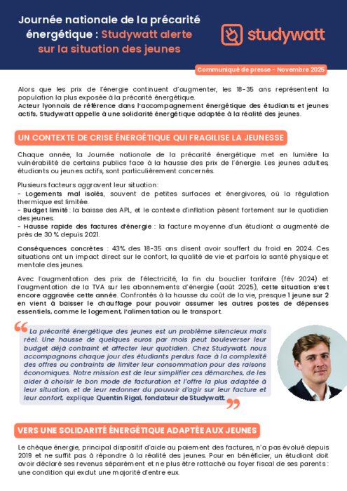 Alors que les prix de l’énergie continuent d’augmenter, les 18-35 ans représentent la population la plus exposée à la précarité énergétique (journée nationale le 18 novembre). Acteur lyonnais de référence dans l’accompagnement énergétique des étudiants et jeunes actifs, Studywatt appelle à une solidarité énergétique adaptée à la réalité des jeunes.