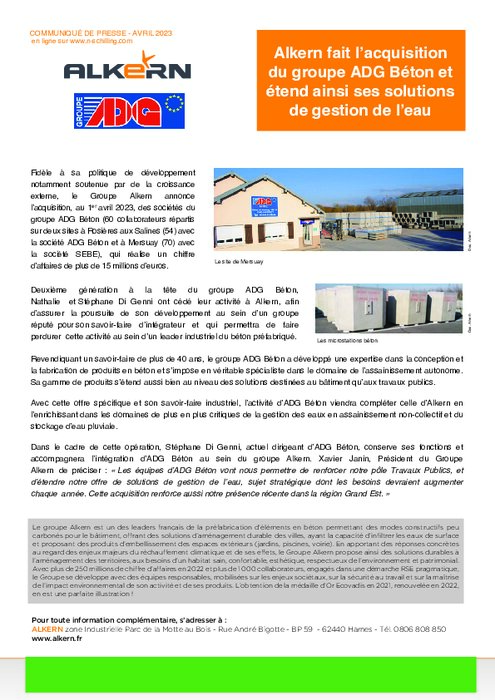 Fidèle à sa politique de développement notamment soutenue par de la croissance externe, le Groupe Alkern annonce l’acquisition, au 1er avril 2023, des sociétés du groupe ADG Béton (60 collaborateurs répartis sur deux sites à Rosières Les Salines (54) avec la société ADG Béton et à Mersuay (70) avec la société SEBE), qui réalise un chiffre d’affaires de plus de 15 millions d’euros.