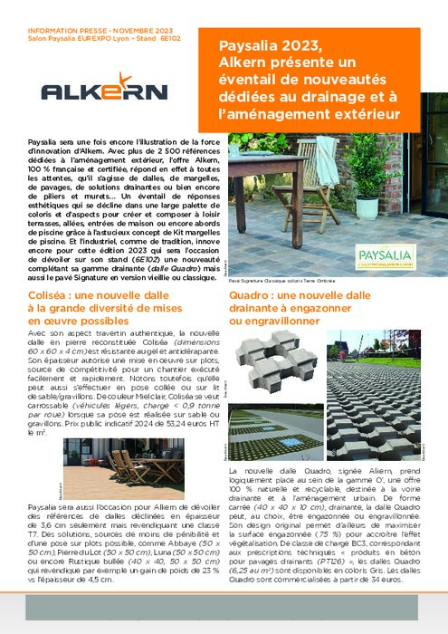 Paysalia sera une fois encore l’illustration de la force d’innovation d’Alkern. Avec plus de 2 500 références dédiées à l’aménagement extérieur, l’offre Alkern, 100 % française et certifiée, répond en effet à toutes les attentes, qu’il s’agisse de dalles, de margelles, de pavages, de solutions drainantes ou bien encore de piliers et murets…