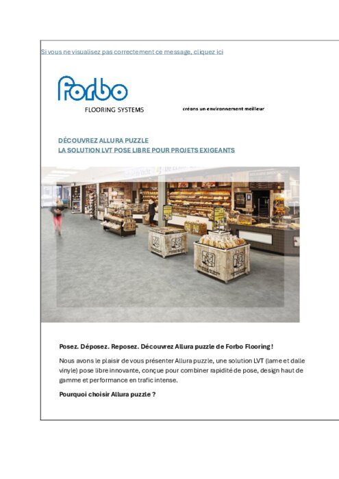 Industriels 04 novembre 2025 - 09:58 C’est une pose 100 % libre, sans colle ni adhésif : la dalle (96 × 96 cm) se pose et se retire facilement, ce qui permet notamment un recouvrement minimal des locaux en activité. PDF (4 Mo) Télécharger