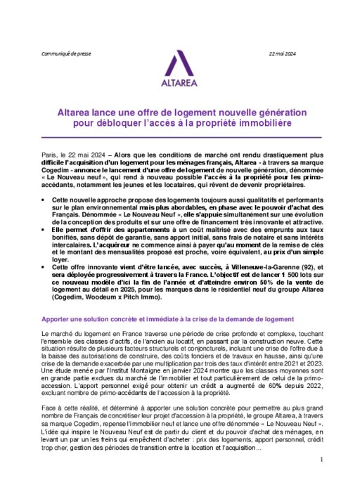 Alors que les conditions de marché ont rendu drastiquement plus difficile l’acquisition d’un logement pour les ménages français, Altarea - à travers sa marque Cogedim - annonce le lancement d’une offre de logement de nouvelle génération, dénommée « Le Nouveau neuf », qui rend à nouveau possible l’accès à la propriété pour les primo-accédants, notamment les jeunes et les locataires, qui rêvent de devenir propriétaires.