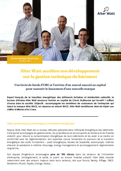 Expert français de la transition énergétique des bâtiments tertiaires et résidentiels collectifs, le bureau d’études Alter Watt annonce l’entrée au capital de Clovis Guillaume qui investit 1 million d’euros dans la société. Objectif : accompagner les ambitions de croissance de l’entreprise qui lance la marque Alter BACS, en réponse au décret BACS.