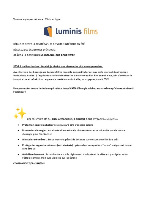 Avec l’arrivée des beaux jours, Luminis Films conseille aux particuliers et aux professionnels (entreprises, institutions, écoles...) l’application sur leurs fenêtres et baies vitrées d'un film anti-chaleur, afin d'atténuer la température et rafraîchir un espace de manière considérable, pour gagner jusqu’à 5°C.
