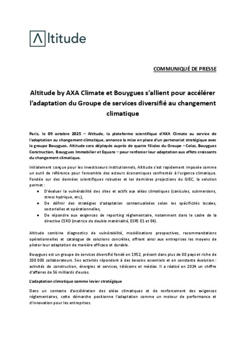 Altitude, la plateforme scientifique d’ AXA Climate au service de l’adaptation au changement climatique, annonce la mise en place d’un partenariat stratégique avec le groupe Bouygues. Altitude sera déployée auprès de quatre filiales du Groupe – Colas, Bouygues Construction, Bouygues Immobilier et Equans – pour renforcer leur adaptation aux effets croissants du changement climatique.