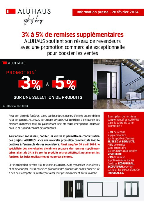 Aluhaus lance une nouvelle promotion commerciale inédite destinée à l’ensemble de ses revendeurs. Ainsi jusqu’au 20 avril 2024, le spécialiste des menuiseries aluminium propose des remises supplémentaires allant de 3 à 5 % sur les produits phares Aluhaus, notamment les fenêtres, les baies coulissantes et les portes d’entrée.
